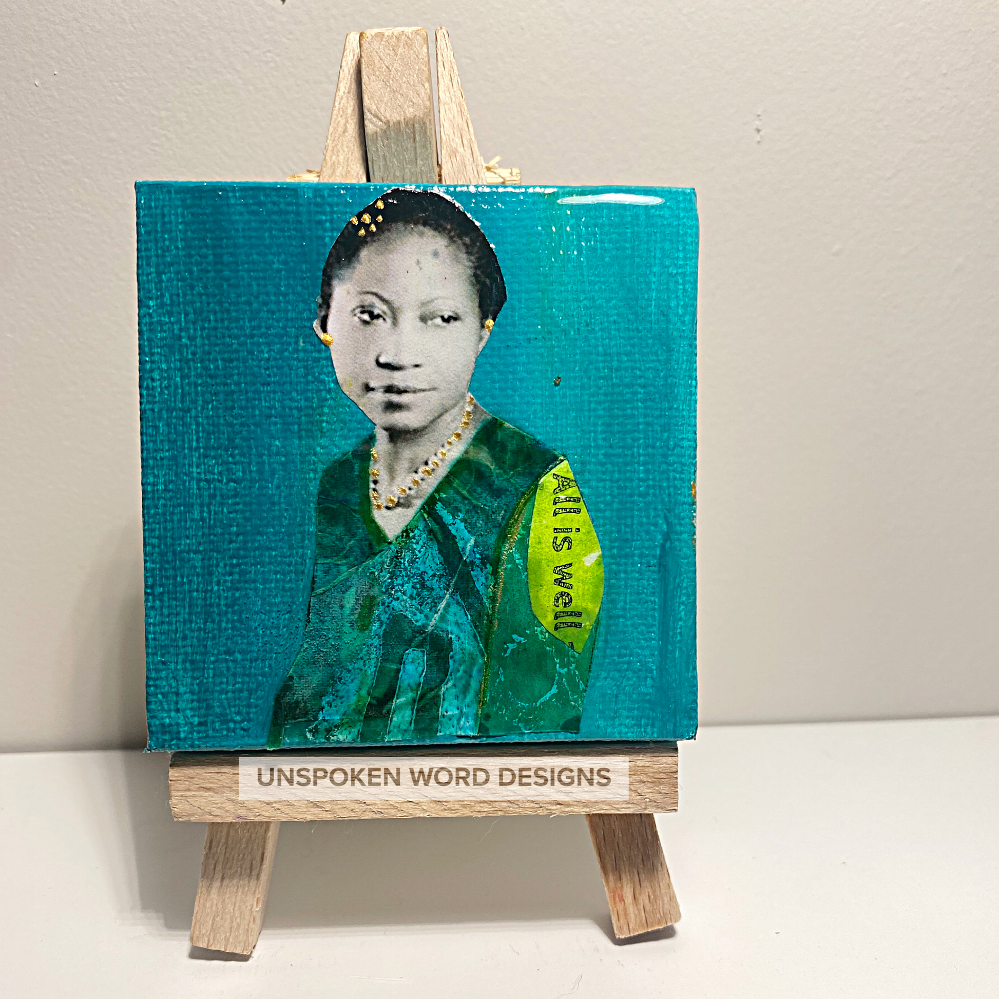 Bring art into your living space with Auntie Augusta. This 2.5x2.5 mini monochromatic collage features the work of iconic sculptor Augusta Savage, who made an indelible mark on the art world. This unique piece is sure to be a conversation starter in any home.