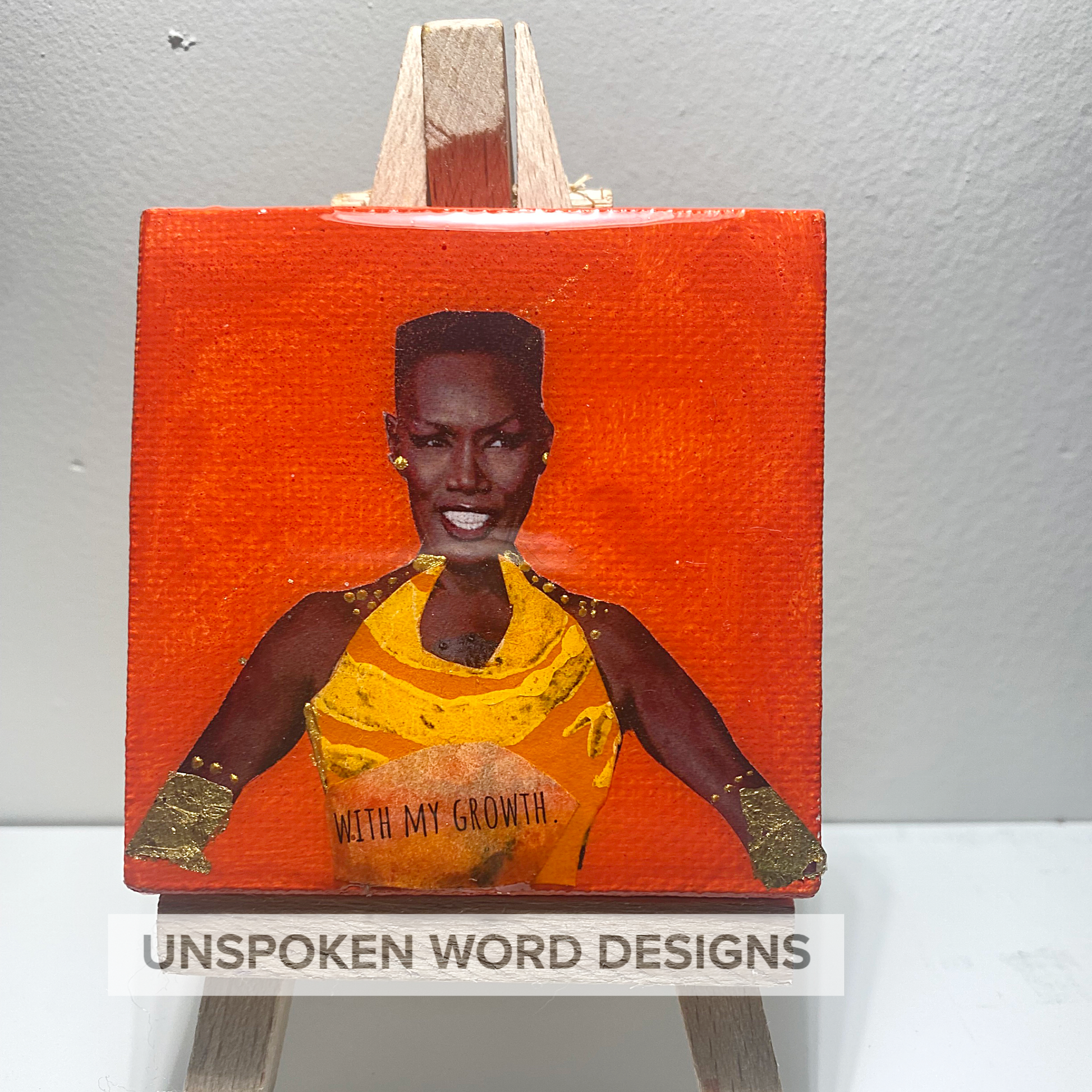 Auntie Grace is a gorgeous 2.5x2.5 mini collage featuring iconic model, singer & actress Grace Jones. This monochromatic piece offers a timeless style to any space, perfect for art enthusiasts looking to add an iconic statement piece to their home.