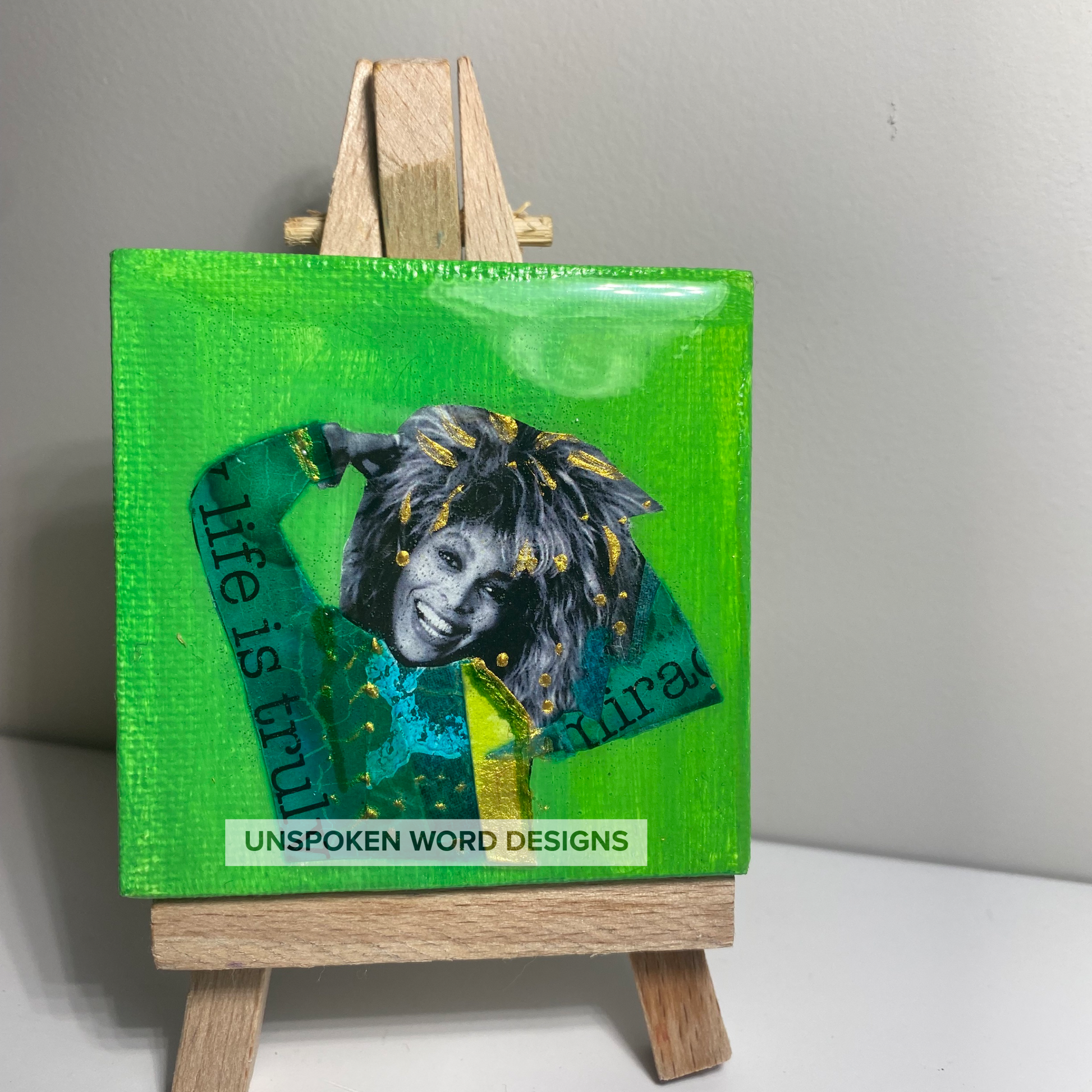 Auntie Tina is a one-of-a-kind mini monochromatic collage featuring legendary singer, songwriter & actress Tina Turner. This 2.5x2.5 piece of artwork is perfect for collectors or fans of Tina Turner and her iconic music career. Enjoy the timeless beauty of this piece for years to come.