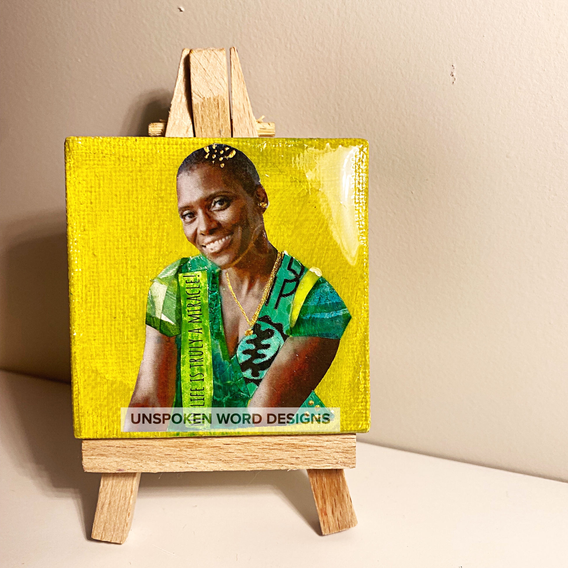 Auntie Yolanda is a mini 2.5x2.5 monochromatic collage featuring the iconic face of skin care chef Yolanda Owens, founder of Iwi Fresh. Own this mini reminder of the woman who has brought natural, holistic skincare to the world!