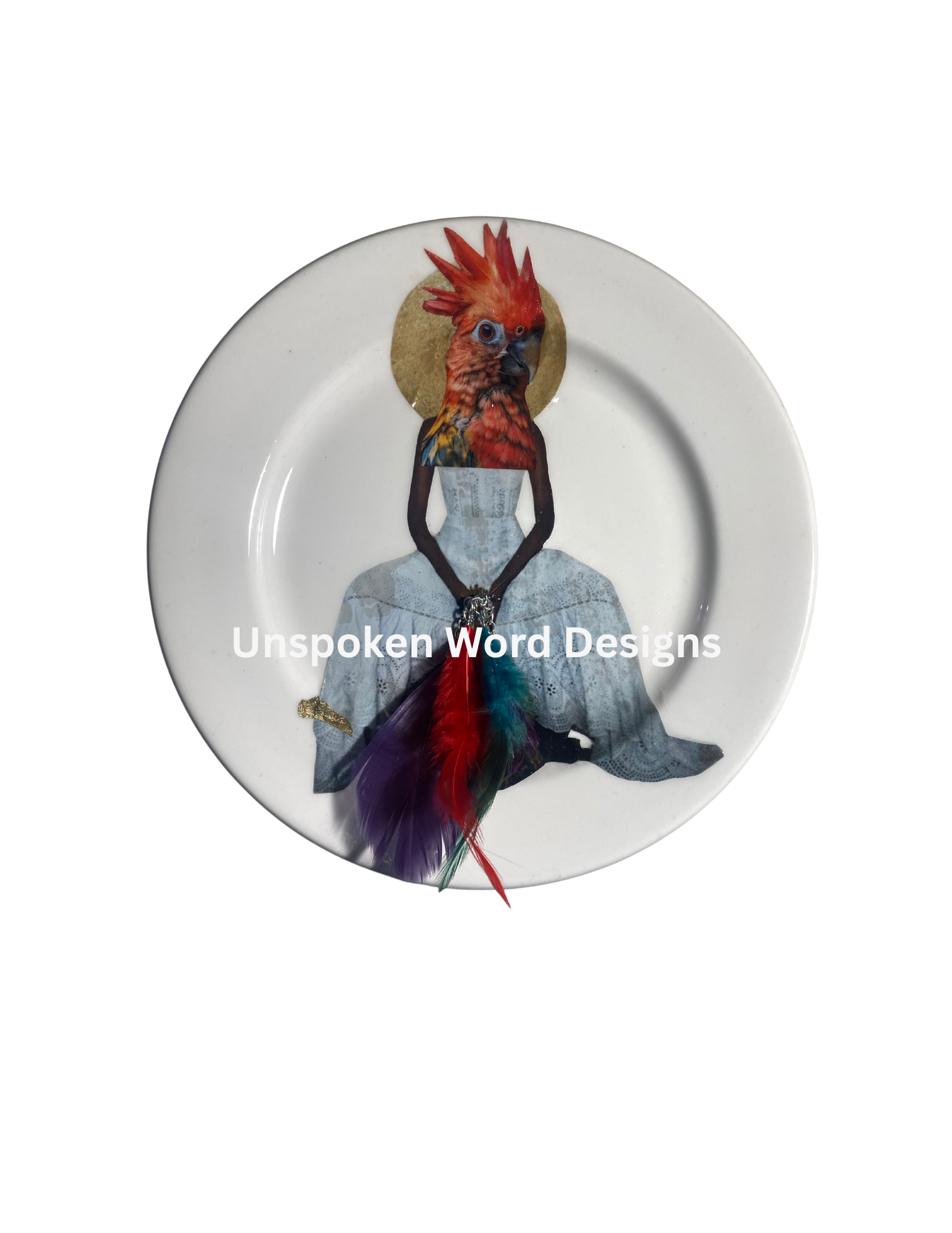 This unique 7x6 mixed media collage plate, titled "Prosperous," showcases expert craftsmanship and artistic depth. Each piece is one of a kind, combining diverse materials to create a visually compelling design. Ready to display, it includes a built-in wall hanger for effortless installation, making it a distinctive addition to any art collection or interior space.