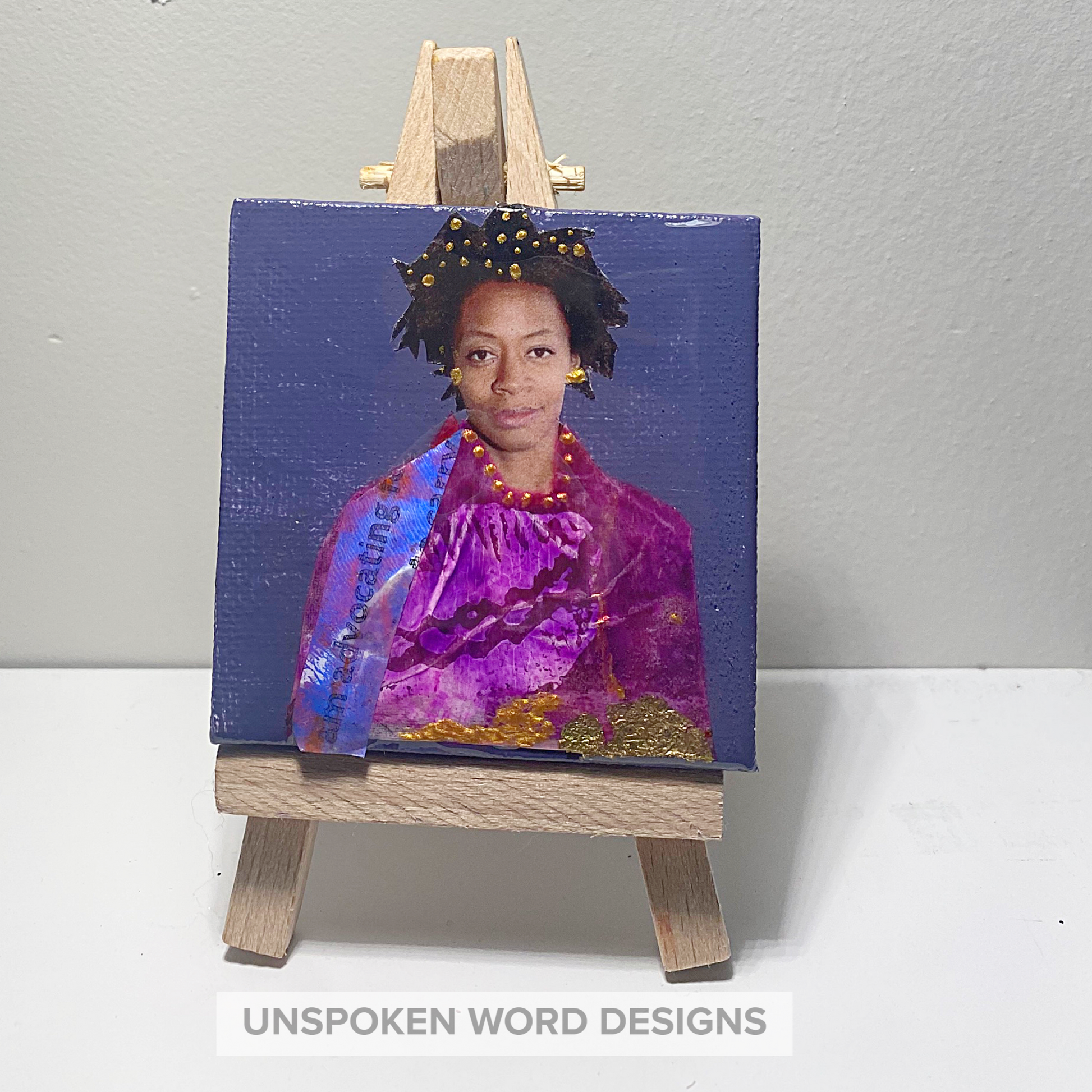 Sister Kara is a 2.5x2.5 mini purple monochromatic collage from the renowned artist Kara Walker. This unique piece of artwork is perfect for any home or art collection, adding a stunning, yet subtle, pop of color to your space.