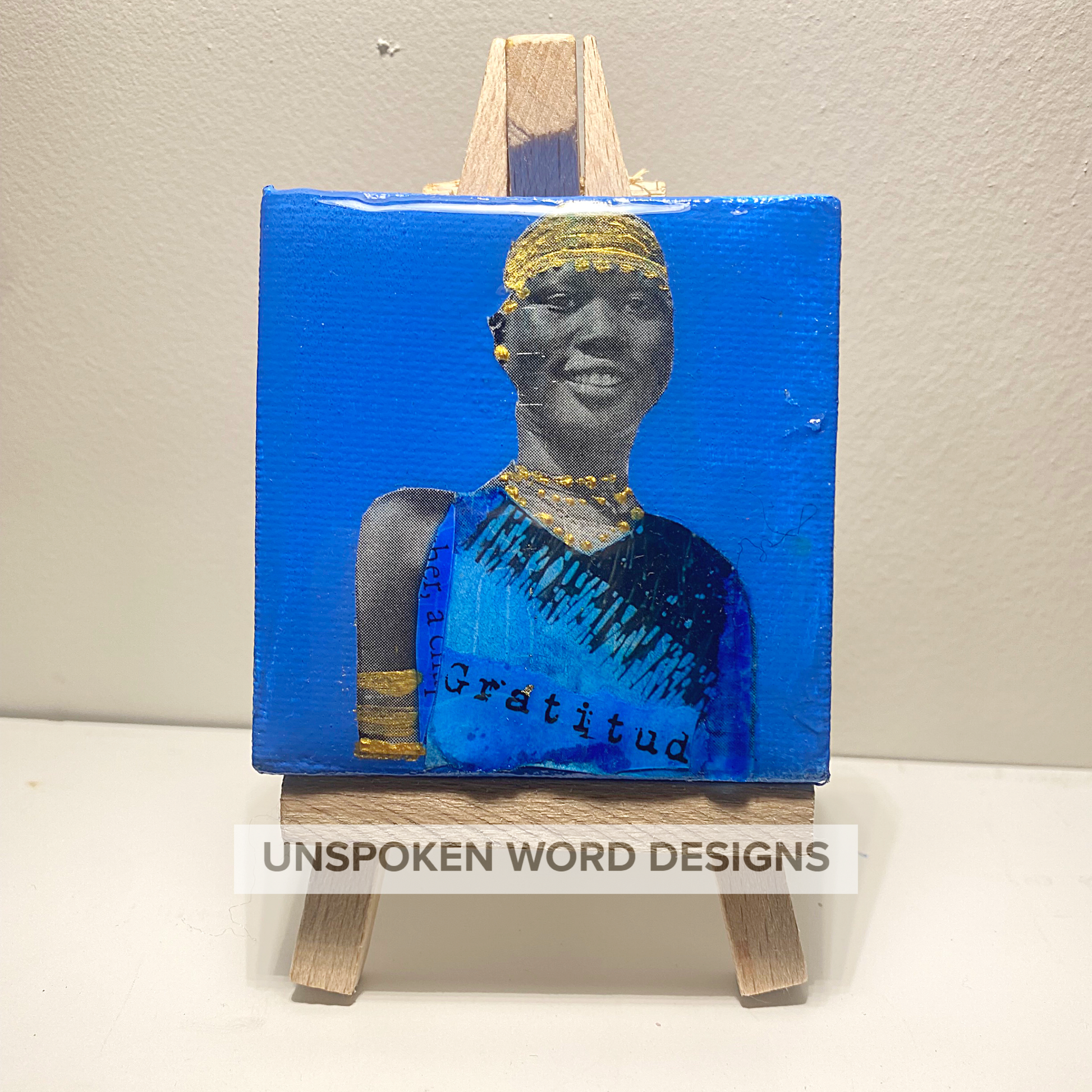 This miniature collage features a sister from the Shilluk Tribe of South Sudan, rendered in a bold blue monochromatic style. The artwork measures 2.5x2.5” and is a beautiful way to show your admiration for Shilluk culture. A perfect addition to any wall or desk.